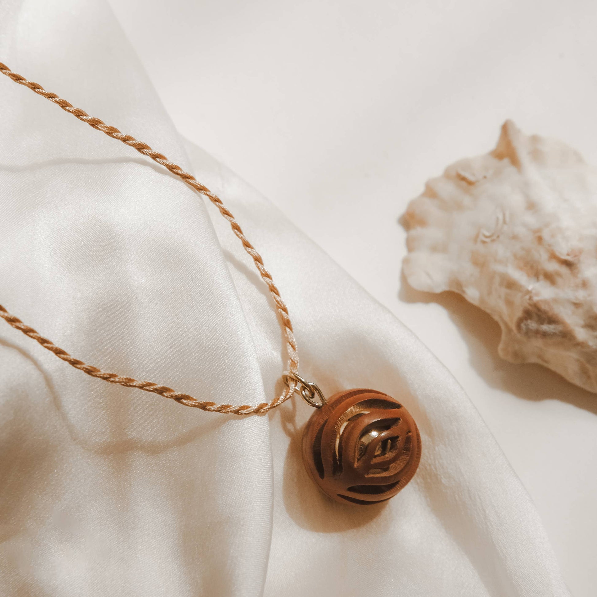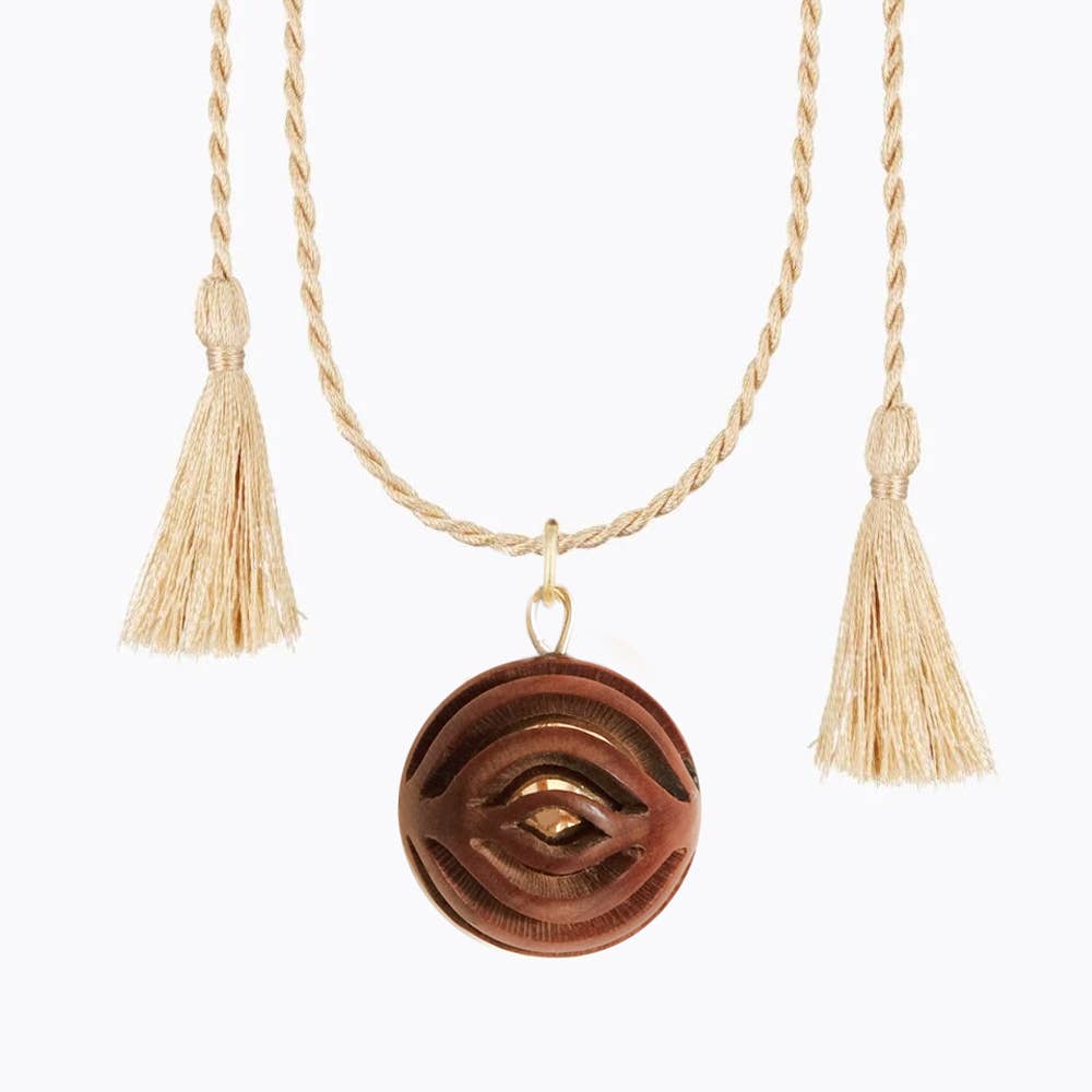 En elegant bola håndlavet af balinesiske håndværkere med en kappe af håndskåret palmetræ. Den udsender en blid, beroligende lyd, som baby kan genkende både før og efter fødslen. Inderkuglen er belagt med 18K guld og bolaen bæres i en silkekæde. Leveres i gaveæske.