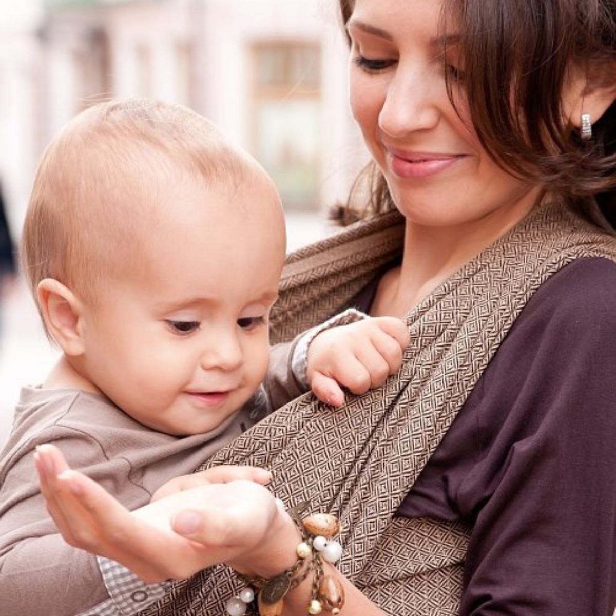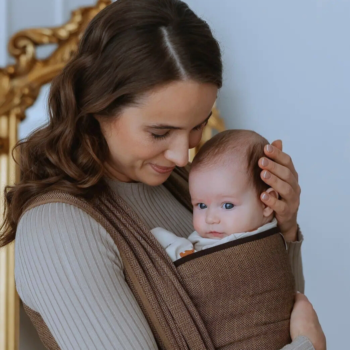 A woven wrap that’s easy to tie and incredibly beautiful. Leo Café is the perfect choice for your very first woven wrap. The fabric glides smoothly and hugs your body comfortably. The pattern is created by weaving two different colored threads in a gorgeous diamond twill. One long edge is finished with a border in the darker color, making it extra easy to tell top from bottom when tying—a detail that’s very important, but can be confusing if you’re not very experienced with wraps.