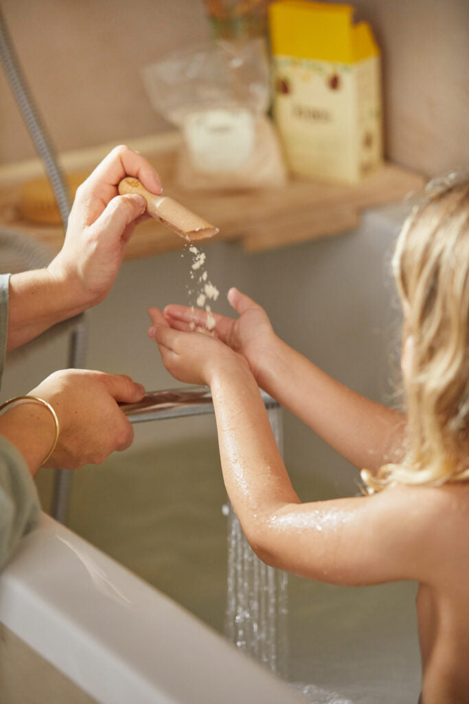 - Tilsæt 2–3 skefulde under rindende, lunkent vand