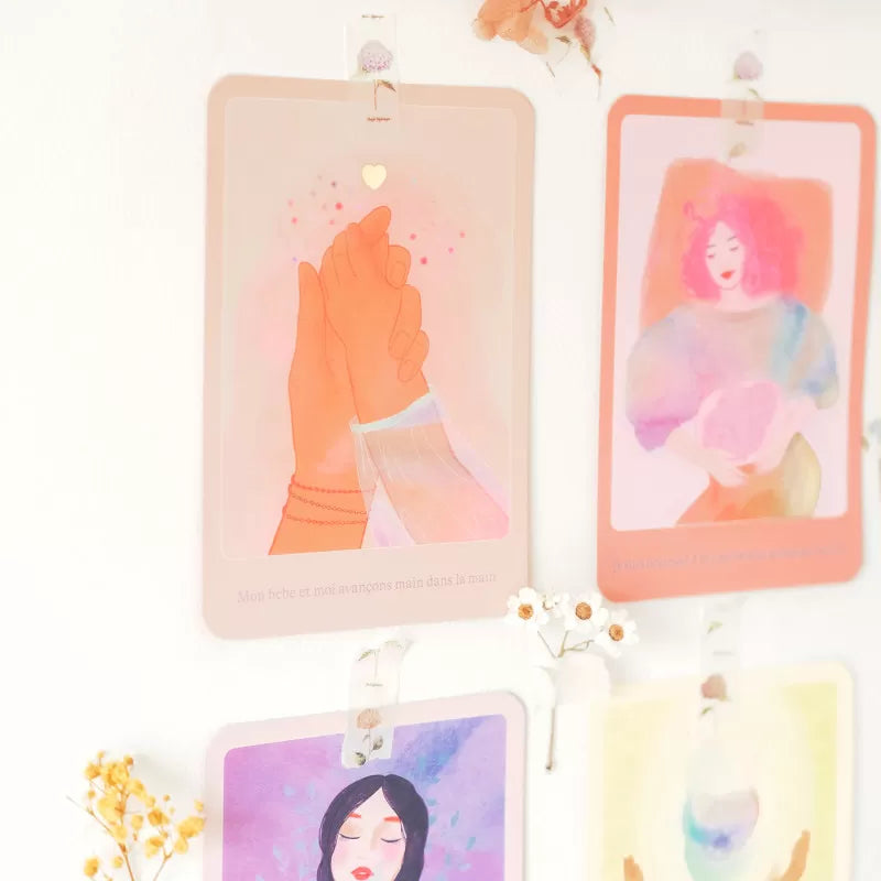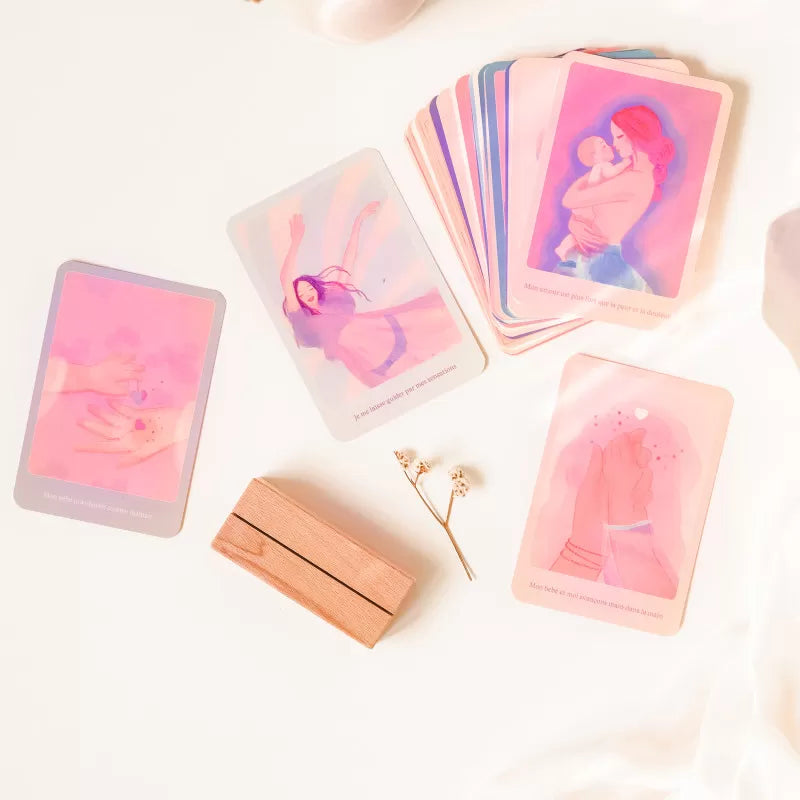 Hvert kort rummer et inspirerende fødselsmantra, smukt illustreret af kunstneren Izumi Idoia.